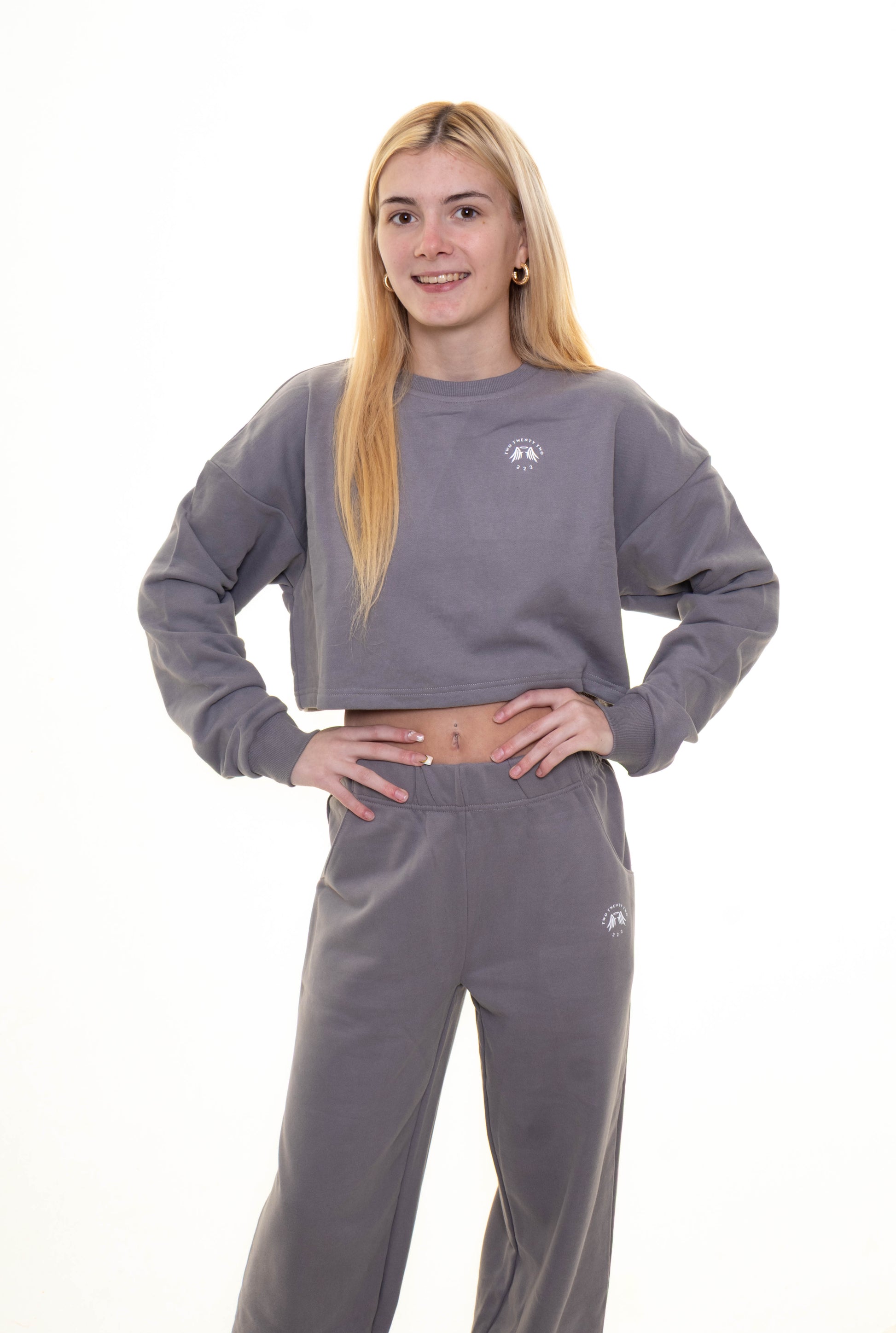 Designed for those who value both comfort and standout style, this two-piece tracksuit blends cozy softness with a bold edge. The cropped sweatshirt features a minimalist front with a small chest logo, while the dramatic open-back cross-over cutout adds unexpected flair—perfect for layering or wearing solo. Paired with relaxed-fit joggers featuring an elastic waistband, deep pockets, and matching logo detail, this set delivers effortless streetwear appeal. Made from premium cotton-blend fleece in a sleek graphite grey, it’s the ultimate off-duty essential that turns heads from every angle.